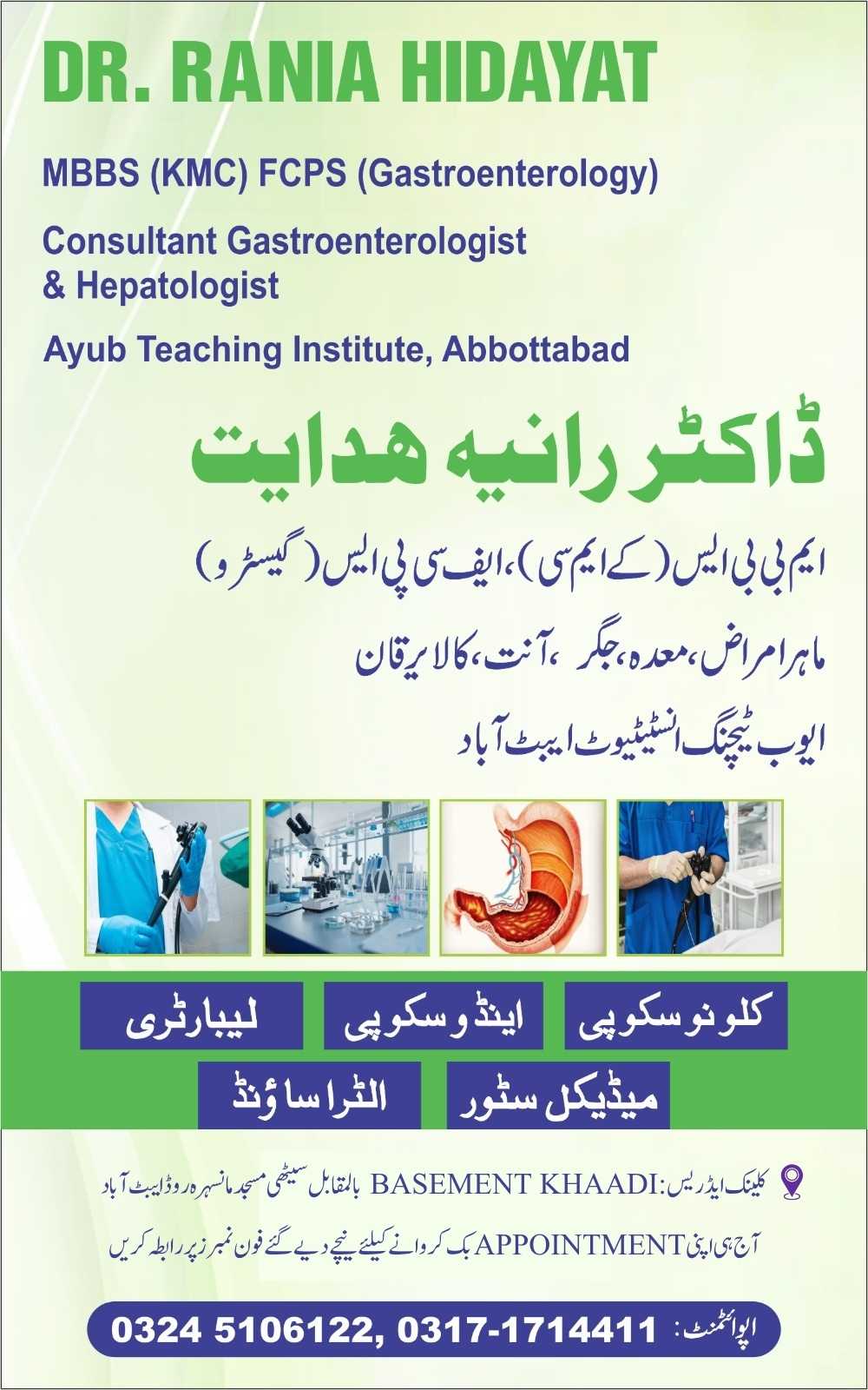 Welcome to the professional profile of Dr. Rania Hidayat, a distinguished Consultant Gastroenterologist and Hepatologist at Ayub Teaching Hospital and Doc Rania Clinic.